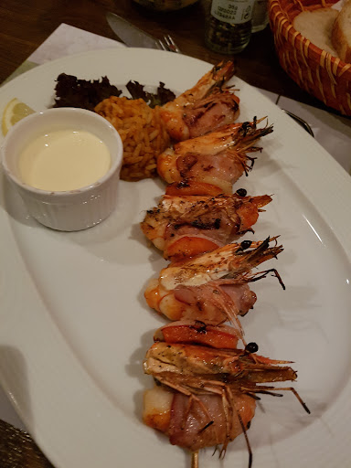 The restaurant located in A/D Rijn about half and hour drive from Schiphol Airport. I was impressed with welcoming family atmosphere...great Greek red wine..23.50€set menu on your choice with starter..main dish and dessert plus salad bar self service during waiting time 50 people fully seated last night The food were all so super fantantic I started with beef cappacio as the starter then chacoal grill shrimp wrap with becon and big mocca ice cream with caramel for dessert. I bought 2 litres Greek red wine back in a very good deal!! However I definitely recommend this...