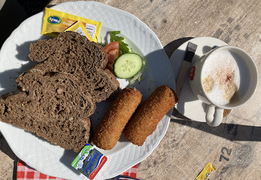 Read moreTijdens een lange fietstocht hier gestopt om wat te eten. De kaart is eenvoudig en weinig fantasievol, maar dat is OK. Het enige "fantasievolle" is een uitsmijter rietsnijder met 9 eieren voor ca. 15 euro. Lijkt mij belangrijk om te weten voor mensen met een cholesterol-tekort. Twee kroketjes met frites besteld, redelijke prijs, maar de bitter lemon en de mayo (1 euro?!) maakten het alsnog prijzig. Zeker gezien hoe de kroketten gebakken waren: wel heel erg donker en of de olie nu echt vers was weet ik ook niet zo zeker. Het terras is prettig, met voldoende schaduwplekken. Er is niet veel keuze in de Biesbosch, dus ik raad het niet af. Maar om het vriendelijk uit te drukken: het is ook geen restaurant waar je ooit in je leven een keer geweest moet zijn... Nog wel iets over de bediening: afgezien van het vergeten bestek heb ik zelf geen opmerkingen. Het was niet slecht en niet goed. Maar op gegeven moment werd een mevrouw, die het terras op kwam met een vraag over parkeren, wel heel erg onvriendelijk bejegend. Ze had misschien een overbodige vraag, maar zo ga je echt niet...