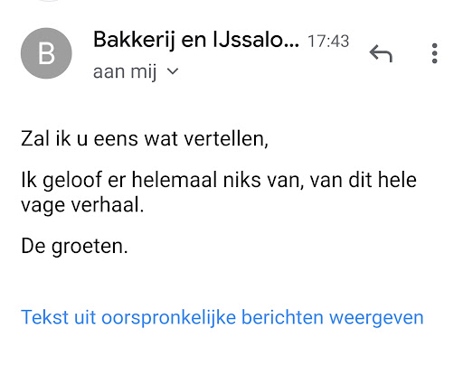 Read moreVandaag samen met mijn vrouw een bezoek gebracht aan Nes voor een lunch, we zijn hier een weekje op vakantie op het eiland. Gekozen voor bakkerij de Jong, er was net een plekje vrij aan een tafel die nog niet afgeruimd was, hier plaatsgenomen, prima lokatie om even op een terrasje te zitten. Binnen 5 minuten kwam er iemand van de bediening om de tafel af te ruimen, we hebben haar beide begroet, maar geen woord terug, de tafel werd afgeruimd en ze verdween weer, we vroegen ons af of er misschien mensen met een beperking werken, dat kan toch… Echter een blik door het raam was voldoende om haar te zien praten met collega’s. 5 minuten later kwam een vriendelijke dame ons begroeten en vroeg of we iets wouden bestellen, uiteraard, netjes wat eten en drinken besteld, drinken kwam vlot. 5 minuten kwam de 3e serveerster het eten brengen met de woorden mijn collega komt zo bij je afrekenen. We keken elkaar aan zo van we zitten net hoezo nu al afrekenen, misschien willen we nog wel meer bestellen. Het eten was niet slecht maar ook niet bijzonder, op zich geen probleem. Echter bij de eerste hap kwam serveerster 2 weer ten tonele met jawel de rekening, tijdens het eten notabene, ik vraag me dan toch echt af waar je fatsoen is, je kan toch even wachten tot mensen uit gegeten zijn en vragen of je ze nog van dienst kan zijn. Als klap op de vuurpijl ging mijn vrouw nog even binnen naar het toilet en ving terloops een conversatie op, zucht daar komen er al weer 2 aan werd er onderling gezegd. Je verwacht nu de horeca weer zonder maatregelen open kan dat men staat te juichen als het druk is en er veel klanten komen? Als toerist ben ik erg teleurgesteld in deze gelegenheid, ik moet overigens zeggen dat ik over alle andere gelegenheden op dit eiland vol lof ben, echter dit is een vreemde...