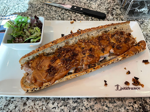 Perhaps it's the Delifrance formula, but for those who don't know, there is a significant price difference between sitting down and take away. A warm sandwich that costs 4,95 for take away would easily become 9,95 when you sit down, order and eat in. Same is also valid for the lunch combo. I ordered a half baguette with warm meat (pork) and saté sauce and fried onion. Unfortunately they put the baguette in the oven with the fried onion so the top layer was charred, which made it very bitter so I scooped it off. The pork was probably a bit too moist when it was placed in the baguette so despite being warmed up in an oven, the bread was quite soggy underneath the meat. Also it tasted a bit funny at some spots but it was largely overshadowed by the large portion of sauce. All in all, not a very good experience. The baguette felt overpriced because of the extra...