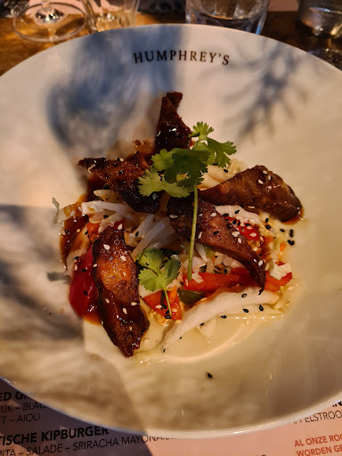 Read moreVia de bankgiroloterij een dinerbon gewonnen van Humphrey's. Nooit van gehoord. Blijkt een keten door heel Nederland te zijn en tijdens ons verblijf op de Veluwe in de vakantie een tafeltje geboekt bij Humhrey in Amersfoort. Het parkeren van de auto bleek een uitdaging, maar dat komt waarschijnlijk door onze plaatselijke onbekendheid. Er waren wel parkeerterreinen in de buurt, alleen hoe kom je daar? Eenmaal binnen verwelkomd door een vriendelijke gastvrouw en we mochten een tafeltje voor 2 uitkiezen op de begane grond. Een stekkie genomen waar we de zaak goed konden overzien. Fanstastische sfeervolle inrichting. Alleen dat al was leuk. Toen kwam het personeel. Allervriendelijkst, alert en attent en dat ging de hele avond door. De menukaart laat niets te wensen over. Ruime keuze of je nu vlees, vis of vegetarisch wil.Voor elk wat wils en voor een zéér schappelijke prijs. De bereiding was ook prima. Om een voorbeeld te geven, we hadden een mixed grillspies met o.a. biefstuk. Het bedienend personeel vraagt raw, medium of rear en de keuken maakt dat dan ook zo. Bijzonder als de andere spiesvleesgerechten kip en varkenshaas zijn. Toppie en het toetje was ook al niet te versmaden. Oja, enne, het voorgerecht van escargots was ook bijzonder. De wijn en het bier smaakten prima en terwijl wij van en met onze koffie na genoten werd de tafel naast ons, nadat de gasten vertrokken waren, tot driemaal toe schoongemaakt voordat er opnieuw werd gedekt. Of dat nu helemaal praktisch is weet ik niet. Het geeft wel aan dat er goed op de hygiëne wordt gelet, wat mij een fijn gevoel over de keuken brigade geeft. Kortom, ik kan niet voor alle Humpry's spreken maar die in Amersfoort...