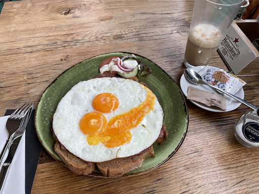Read moreWe gingen voor de lunch. Ik nam een uitsmijter. Aan een gebakken ei kun je weinig verkeerd doen, dus dat was verder prima. De bediening viel echter erg tegen. Toen de drankjes op tafel waren gekwakt, was de serveerster zo snel verdwenen dat we geen eten bij haar konden bestellen. Toen we eindelijk eten konden bestellen, vroeg mijn tafelgenote nadrukkelijk om een caesar salad zonder tomaat, vanwege een allergie. De allergie werd omstandig niet genoteerd, omdat er toch geen tomaat in zou zitten. Dus stond er een poosje later een salade mét tomaat op tafel… Daarna kostte het veel moeite de aandacht van de serveersters te trekken. Zonder enige vorm van excuus werd de salade meegenomen, waarna er een poosje later een salade zonder tomaat op tafel werd gezet, opnieuw zonder enig excuus. De serveerster was zo snel verdwenen dat een drankje bestellen niet meer lukte.