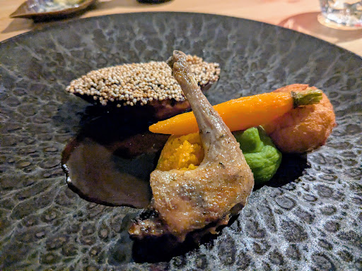 Het hoofdgerecht met 2 bereidingen van duif, een borstfilet en een geconfijte bout kwam ook niet zo goed uit de verf. De garing van de borstfilet was ontzettend goed, maar de geconfijte bout weer wat aan de droge kant. Ook het sausje wat erbij zat was zoutig maar ook niet met een hele uitgesproken smaak .