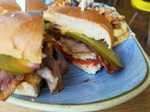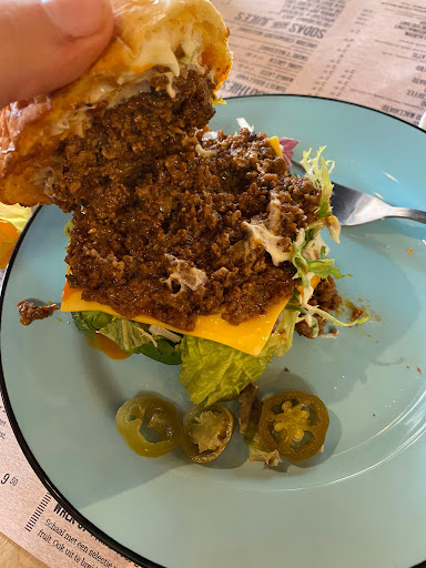 Read moreMijn vriend en ik kwamen hier langs om te gaan lunchen. Normaal kom ik met mijn moeder bij de Blueberry's cake eten, maar dat staat al klaar in de koeling. Wat mij vaker was opgevallen dat het soms lang duurt voordat je eten komt en ik hoor van andere klanten dat zij ook al +30 minuten zitten te wachten op hun eten. Dit keer nam ik een sandwich genaamd 'Sloppy Joe'. Het duurde 40 minuten tot dat het eten op tafel kwam en wat je dan ziet is dan gewoon zwaar teleurstellend. Sloppy Joe van €9 was een karig broodje met sla, gehakt, cheddar, augurk en jalapeños (op de foto is het augurk en jalapeños eraf gehaald). Na 2 happen proefde je al een enorme hoeveelheid olie en zout, waardoor je gelijk geen trek meer hebt. Mijn klachten zijn doorgegeven aan de medewerksters, maar toen ik vertelde dat de prijs verhouding not-done is, werd dat snel onder stoelen en banken geschoven. Voor €9 verwacht een gemiddeld mens het gerecht met daarnaast nog een salade of een klein portie chips. Aan de andere recensies te zien klagen er meerdere mensen over de prijs/kwaliteit verhouding, waarom wordt daar niks mee gedaan?
