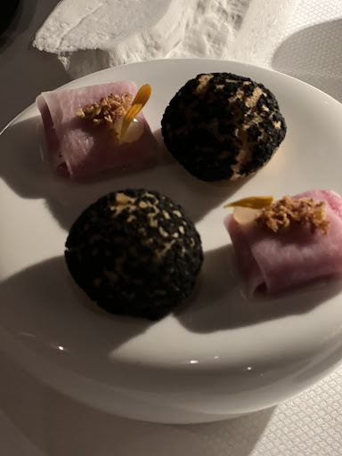 We absconded from the slightly forced-upon-us wine pairing - diving in the wine list I went into shock really: the wine card suffers some issues... firstly it is overpriced, with wines we would normally expect around the €90-100 mark being at €125 and plus - someone here knows where to make the extra buck but this is slightly indecent. Secondly, upon requesting the Vaqueyras 2018, the sommelier gave us some confusing explanations that the last bottle was served the day before. When I commented that in that case the wine should have been stricken from the list, the sommelier then offered another year of the same producer "but it is my last bottle"... We settled for the 2022 (not that we had a choice) which is a mostly average year vs. 2018. I guess at €69 (the only bottle in the 2 digit range) this is not a great multiplicator for them. Casing point! Thirdly, whilst the wine card has a good selection of Californians, SF and NZ wines, absolutely no representation from South-America.