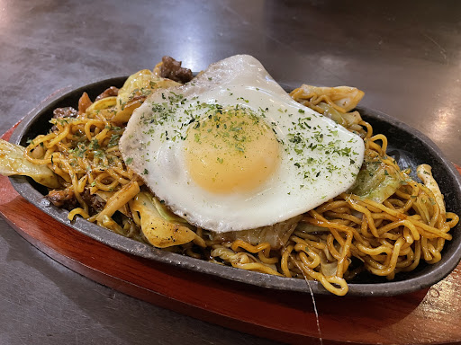 Read moreWe ordered a portion of gyoza, ishii sauce yaki soba and a pork okonomiyaki with noodles. The gyoza was OK, the soba dish was tasty with very yummy noodles (chewy). Unfortunately for the toppings the veggies were too far done and they used pink (small) shrimps instead of the regular sized scampi's. Also, the portion was a bit small considering the price. The okonomiyaki dish was fine and adding noodles was a nice touch but there was too much sauce on top so it overpowered the dish a bit. We also thought bacon would have been a better choice instead of pieces of pork. We rated our experience 4 stars for the above reasons but also because of the appearance of the restaurant. The bookcases stuffed with Manga books were very cool. And the wall decorations were nice too. But the tables and seats definitely need some maintenance. The couch where we were seated had chunks of surface missing and the table was unstable.