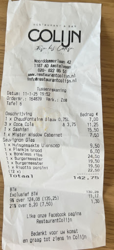 Read moreWe ordered our first dinner out of Colijn last night, mostly to support local restaurants in our neighborhood during the lockdown. So our expectations were not too high but we were in for a big treat. We ordered the steak and the burger and the quality was top notch and the portion size was really big. Definitely worth from any aspect. We will definitely order more from Colijn. They delivered the food in an amazing packaging too. In a thermally insulated box which they collected the next day. The gentleman who collected the box asked me something which with my broken dutch thought at the time was whether the food was cold when arrived but on second thought I think he asked if the food was warm enough. So in case he is reading this, apologies for my broken Dutch and the food was in excellent temperature and excellent quality. Thank you! And...