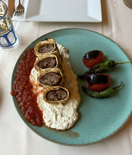 Gevrek (36 €): My personal top choice. Hand-ground lamb kebab wrapped in lavash bread, served over aubergine-yoghurt puree and garlic-tomato sauce. If you enjoy smoky eggplant and creamy yoghurt combinations, this is unbeatable. The bread layer gives it extra texture – though I personally like it a bit thinner (hamur side dominates slightly). Still, the sauce and meat balance it beautifully.