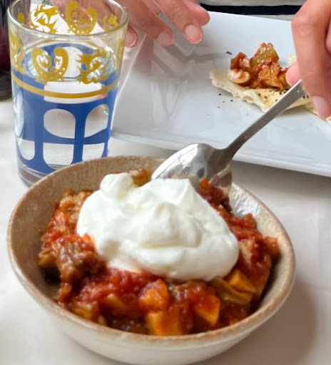 Kopoglu (7,50 €): Fried aubergine cubes with potato and green pepper in tomato sauce, topped with yoghurt. Comfort food, slightly oily but perfect if you like rich meze.