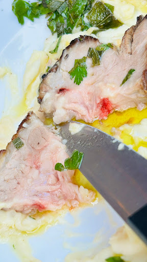 Unfortunately my pork main dish was raw and bloody in the centre. When I complained the âcookâ told me that food cooked sous vide is sometimes bloody. This is not correct for pork. It should not be bloody or chewy/slimy - as you can see from the photo it was not cooked. He offered to heat it up further. I was not comfortable eating it at all and stopped after one mouthful as soon as I saw the blood. I asked if I could have the fish main course instead. He declined stating I had already eaten most of the pork. This was a tiny slice of pork and as you can see from the photo one bite is gone. There was gristle and raw meat. Absolutely disgusting.