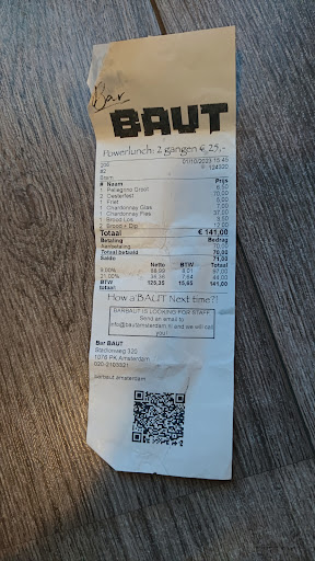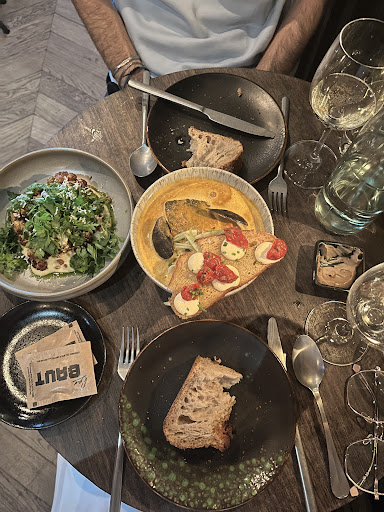Read moreThis week we went for lunch at Bar BAUT. Booking was effortless via the website. Upon arrival, the reception was welcoming and informal—the best variant of casual. The interior is modern chic and made of the proper materials. It has the warm, trendy glow that you find in most new fine dining establishments today. We could choose from two tables and chose a large round table. The host immediately came to ask what we wanted to drink and whether we had any special wishes. The drinks were immediately on the table, and we looked at the menu. We noticed that they offer a lovely selection of fusion dishes. It's hard to choose because they creatively describe them. We both chose the Tom Kha Kai soup and a grilled vegetable salad. Since neither of us drinks alcohol, I cannot comment on the wine list. The soup came through quickly and was served in a beautiful stone bowl to go with such a soup. The taste was marvelous. The best Tom Kha kai soup I've ever eaten. With a subtle spiciness and a nice amount of fresh vegetables. The broth was simply outstanding. After the starter, it took some time for the grilled vegetables to be on the table. We liked that so we can have a chat. The dish was a bottom of excellent butter lettuce topped with beautifully grilled flavorful vegetables. On top and underneath the salad, we found a great hummus—another success. A healthy lunch at this level that is also wholesome is hard to find, but this is. After an average cup of coffee with a good cookie, we settled. Including tip, we paid 40 euros for the soup, grilled vegetables, and two cups of coffee. All employees, including the kitchen brigade, took the time to wish us a good day. A very successful day, partly thanks...