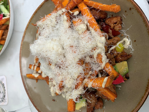 Vibrant venue with outdoor tables by a fountain, offering burgers, meze platters & drinks.