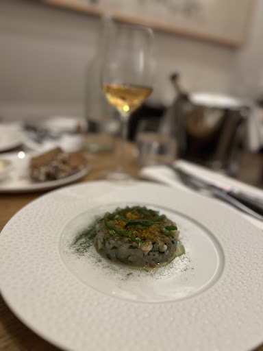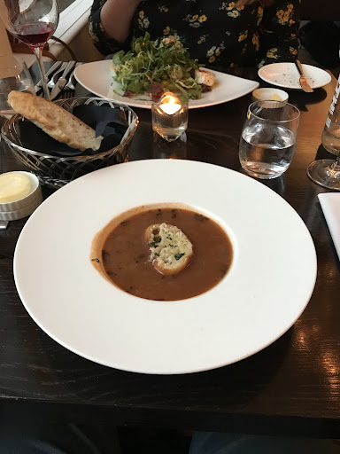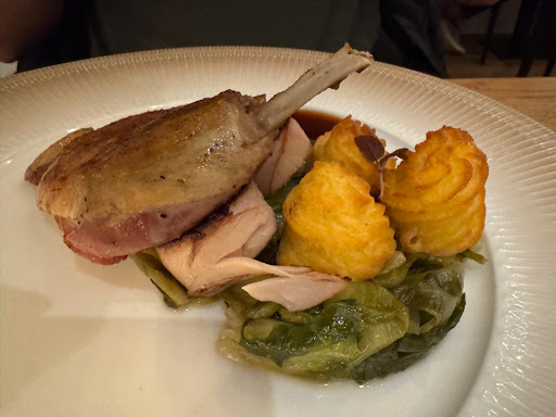 I was pleasantly surprised with this wonderful French restaurant nestled along its accompanying hotel in a quiet street along one of Amsterdam's many romantic canals. The ambiance was romantic and charming, the walls adorned with a carefully curated and captivating collection of Cobra art, reminiscent of American neo-expressionistic and contemporary genres. The food was superb, with the menu comprising a relatively modest but carefully curated set of traditional french and Mediterranean dishes. I am a big fan of the Parisian "confit du canard" (pictured here). I have to say that I was very skeptical of the dish upon first impression - the skin was not crispy nor did it have the deep caramelization associated with its traditional counterpart. Biting into it however, it was clear that the chef had chosen instead for a sous vide preparation - a first for me - which gave the meat inside a firmer yet moist - almost "ham" flavor and consistency - that not only kept the same delicious flavor I have come to love of this dish but elevated it in a novel dimension I had yet to experience. This was a big success and a most welcome surprise. Great dish! My wife's dish - a pesto-citron italian inspired ravioli - was also incredible. It was very al dente as it should be and packed with flavor infused by a combination of olive oil, calamata olives, tomatoes, pesto, citron, and of course, ricotta. Delicious! The red wines by the glass comprised a small yet well curated list of french and italian wines - I had a 2024 St. Emillion for 11 euros that had all of the familiar aromas of the Bordeaux favorite. One of my favorite parts of the evening was Albert, our waiter. We had several engaging conversations with him and to say the least, he made this a most memorable night. Not only did he give insight into the culinary scene in Amsterdam but also gave us a tour of the hotel's charming bibliotheque and lounge - and the many wonderful works of art illustrating its walls. He wishes us goodbye in the most gracious fashion - walking with us to the door and shaking our hands. This is service of the highest caliber - one we have come to expect only from some of the very finest dining experiences out there. It was genuine and charming, and made for a beautiful night. I give this restaurant two big thumbs up....