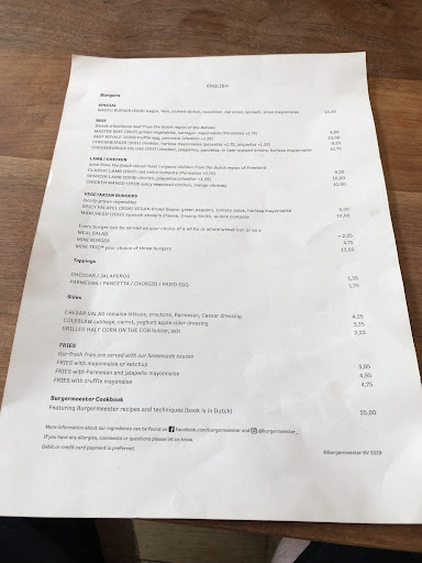Arrived shortly after opening during the middle of the week. There were few other people so no problem finding a seat inside. There is indoor and outdoor seating at this Burgermeester. Menu expectedly features a handful of burgers, extra toppings and sides. You can order regular size burger, mini sized or a a mini-trio if you want to sample a few different burger types.