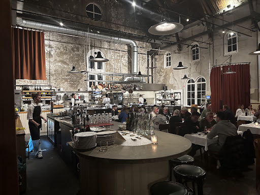Stepping inside, the dimly lit, cavernous industrial space feels like a welcome refuge. With our reservations in place, we were swiftly led to a table along the far wall, offering a somewhat oblique view of the kitchen. We didn’t mind—it felt private.