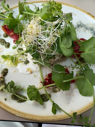 Paid €34 for the worst tuna steak of my life. Most chefs cook tuna very lightly with a gentle sear on each side. This thick tuna steak was 75% grey, tough and dry with a thin pink centre (see photo). They did ask how I wanted the tuna and I said: “I defer to the chef to cook it as is recommended to taste best by the chef.” I then added: “I am accustomed to eating tuna almost raw.” And this was the result! However, my dining companions said they enjoyed the carpaccio starter with pesto, the lobster soup, the grilled sole (a large portion), tender ribs, and a steak. Note: The three sides cost extra, and were loaded with heavy, thick, gooey sauces rendering them all nearly inedible: a salad drenched in something resembling the texture of mayonnaise, a baked potato drowning in 1/3 cup of buttery cream sauce, and seasonal vegetables (asparagus) were swimming in a sea of viscous, heavy, yellow, buttery or cheesy liquid. If you love vats of dripping cream sauce on your vegetables, this restaurant is your perfect destination! The dessert and coffee was good. Hazelnut ice cream with caramel topping was tasty, with excellent decaf espresso. The brownie with ice cream and chocolate sauce was also enjoyable. Overall has the vibe of a bar more than a restaurant, with loud thumping bass-heavy music making it close to impossible to have an audible conversation. Outdoor patio is quieter, is covered and...