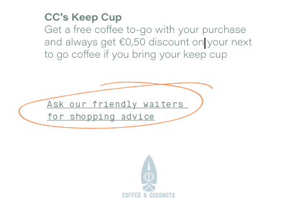 Read moreQuite rude server and waiters. They seem to only offer discounts via keep cup when it suits them. Have gone for months with sometimes a discount offerred and others not, dependent on who is serving. When asking about the discount they say (oh only when its above X euro do we offer it). their own menu states you ALWAYS get a discount... i will stop going to this location and happily pay more now at the BLACK brewer down the...