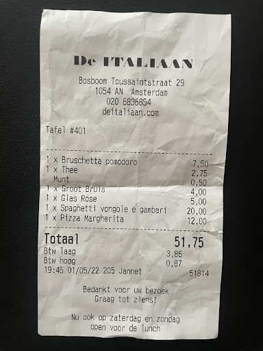 Read moreWe've had lunch here a day ago. Chose this restaurant after going through the reviews here. Bad idea. The waitress who served us was rude from the first interaction. Asked for table inside and we got a reply that "well I have no tables". Behaved as if she could care less of we wanted to eat there or not. We waited , on the terrace, rainy day, around 10 - 15 minutes to only be told "well you can sit anywhere you want on the terrace". Waited for yet another 10 minutes to be given menus. No non-alcoholic drink menu. Asked the waitress what hot beverages they had if any - "well coffee and tea?.." as if we should've already known or maybe as if we should've imagined that's everything they serve hot... 1/3 of menu is in Italian, 1/3 in Dutch, 1/3 in English. Pizza was greasy and very wet. Just go...