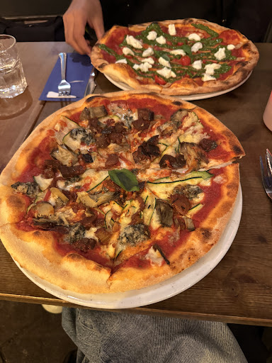 Read moreDelicious pizzas in a laid-back atmosphere. Hip and cosy setting, with a mixed crowd. Pizzas are mouthwatering, crunchy and with just the right amount of toppings. Staff is friendly, but aren't the best hosts I've ever had. On a Friday evening, you can only reserve a table for a 2 hour block. What doesn't help is that service isn't on top of their game with taking orders and checking for empty glasses. We took it easy ourselves, but the staff wasn't quick and available when necessary. We got asked (in a friendly manner) if we could vacate the table after 2 hours and therefore weren't able to have desserts. Pity, because if our orders would have been taken earlier, we would have had plenty of time for desserts still. High chair is available. No smaller or half pizzas available for children though, which is a bit odd, because it seems like very little work and my 1,5 year old won't finish a...