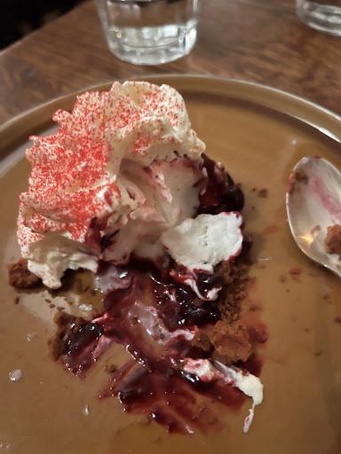 For dessert with had a raspberry sundae, It was a layer of cake, raspberry ice cream on top and mini meringues around the side.