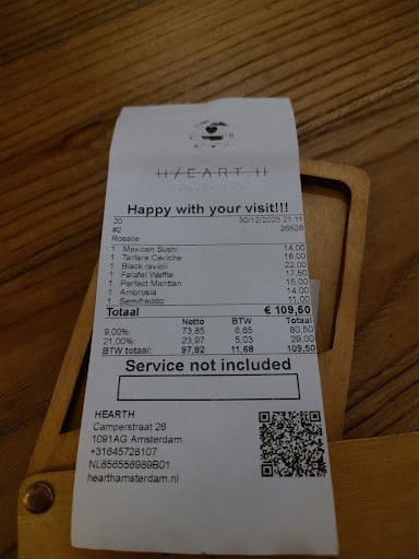 Read moreWe dined on 10th August 2024, and although I'm only getting to this review nearly two weeks later, the experience we had at HEARTH has not left me. Vegan / gluten-free dining has often left me underwhelmed, and I'm keen to review in this space more frequently, so I'll start here. In summary, we loved it. The colours, textures, presentation, and taste all married well together, and it was clear when I saw the chef's pass when I arrived that my best offering was to try a few dishes. I won't name them, as I think all future diners should go with their own instincts and preferences, but I enjoyed everything I ate and reluctantly shared it with my partner so we could discuss each dish and its merits. The restaurant is pricey but the ambience, staff friendliness, and food did not leave us feeling underwhelmed whatsoever as our waitress went out of her way to host, and even brought the chef over for some pleasantries. This has been one of my favourites to date, and I'll be returning when I'm next in Amsterdam. A full house, some tasteful music, and passionate staff add to the evening but most importantly, the food was the star. One negative was that we were charged for a bottle of sparkling water which we never in fact had, but even though I noticed it, I was too happy to mention it. We spoke about the food all the way home. Thank you to HEARTH....