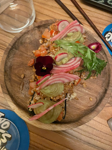 We started with the Syrian-inspired sushi featuring red quinoa, which was a symphony of flavors. The quinoa's nutty texture, combined with the soft, marinated eggplant and the sharpness of pickled cucumber, created a delightful contrast. The smoky tofu added depth, and the dish was beautifully adorned with smoked paprika aioli, adding a creamy, spicy kick.