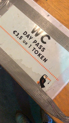 Dat de plek ver weg is vonden we geen probleem, het heeft wel wat om door het donkere deel van Amsterdam Noord te fietsen. Maar we voelen ons wel enigszins afgezet door de locatie. Vijf euro om een kluisje te kunnen gebruiken (er is geen garderobe oid), ruim twee euro (een half muntje, vijf muntjes waren € 21,-) om die avond nog naar de wc te kunnen.