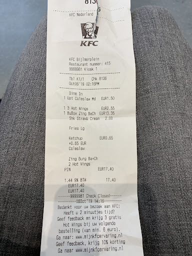 Read moreHad lunch there earlier today. The coleslaw salad has expired at 5:55 am on the 5th of October (today is 6.10.2019). When we raised this with the staff, they had to go through an entire row of other expired coleslaw packages until they got a good one. They did not apologize or dispose of all the expired packages. They also forgot to give us our chicken wings for which we had to go back. Now I have stomach ache and after checking all the other reviews I understand why. When going to a chain like KFC people expect to have fresh ingredients and consistent quality across the restaurants. This is unacceptable and should be investigated by SZW Inspectorate and the Netherlands Food and Consumer Product...