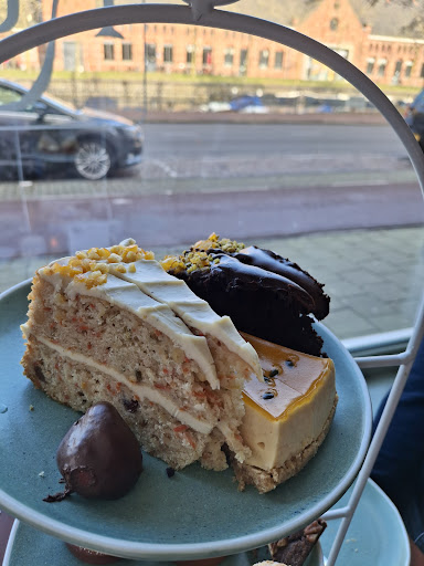 Read moreThis a cute little cafe with a great tea selection. The coffee and cake is vegan. The staff were very nice and the service was pretty good. The coffee is ok for Amsterdam - if youâre a coffee fanatic I wouldnât recommend this place, but if youâre a vegan (or unable to drink cow milk) then the coffee here is not bad at all - otherwise give their selection of tea a go. I usually love vegan chocolate cake - as it is dense and moist - but the chocolate cake here was dry and crumbly, it was a bit disappointing even though the flavour was okay. And the passionfruit cheesecake is not really a cheesecake... but more of a biscuit base with a delicious vanilla slice style custard topped with a very nice layer of passionfruit jelly. It wasnât what I was expecting but I enjoyed it very much. Overall - it think this is a nice place and I would give them a second visit (in case I just went on a bad day)... Also they have a mini high tea for 2 on the menu that looked really interesting. One thing they could improve is how they greet people when they come in - or even having a little sign saying to just sit...