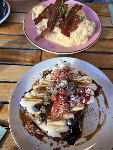 The orders are both wrong. More waiting. Incorrect orders come after 30 minutes, ten more minutes before a coffee can arrive. It's almost humorous how bad everything is. Taste is bland. We order 2 beverages each, 2 breakfasts and a pancake dessert. An indulgent start we enjoyed the day before, but was a never ending joke of bad slow service and lifeless food.
