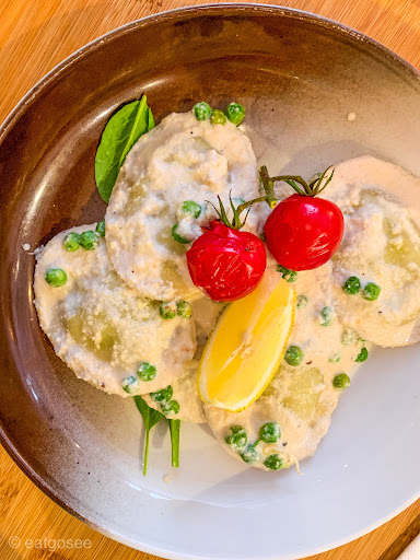 The pea ravioli with celeriac, green peas and lemon cashew sauce is vegan and a plate of spring; however, it is very under seasoned needing a lot more salt, pepper and a slick of olive oil. It would also benefit from mint or another herb to lift the dish further.