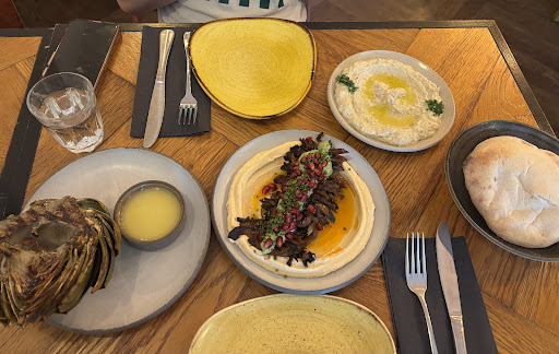 The chef there is a rare talent! Bravo! Excellent taste and all dishes were prepared with love. As a cook, I was very inspired. Mediterranean cuisine here is definitely touched by a passion for fresh ingredients ; nothing we had was overdone or dry, so we felt as if the execution of these traditional Mediterranean dishes was much better than in the countries of its origin, which is a big thing to say as one of us actually comes from these areas. It felt like a Fantasy of the Mediterranean cuisine and chef's perfected version of it. Despite an advice given by a waitress to take around 3-4 small plates per person, 4 plates were enough for our dinner for two. It's because for us it's all about the taste and quality, not necessarily about the quantity. We have ordered lamb kofta, chicken with hummus, and grilled chicken breast with spinach, accompanied by smokey grilled broccoli and it really filled us up. All meals were savoury and rich, but perfectly balanced and fresh tasting, and much fun and entertainment if it comes to variety & textures. It was a true treat for our tongues ! The place has a modern, minimalist, yet cozy interior and atmosphere. The waitress seemed very professional, taking her job and guests seriously. The chef brought our meals to the table himself which was a lovely surprise, he did that maybe because we have watched him preparing our food via an open space leading to the kitchen. The chef was super polite and humble and the food made us very happy and appreciated as customers and guests.