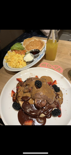 Delicious American Style Pancakes! My boyfriend and I visited MOAK Pancakes after being recommended to go by a friend. We decided to go to the MOAK Pancakes West as it was closer to where we were staying, there is also another one in Amsterdam City Centre. The interior of MOAK was nice and modern. The staff were friendly, welcoming and accommodating. We were greeted and given menus and showed to where there was seating. We then took a seat on the table of our choice and after a few minutes we were greeted by a waitress to take our order. We ordered drinks first and then we ordered our food. To drink I had the Pear Juice and my boyfriend had the Grape Juice and a Coconut. To eat I ordered the Blue Magic Pancakes (but instead of blueberries I asked for Strawberries - essentially making it a Red Magic instead of Blue Magic) and I chose to add Bacon. My boyfriend ordered The Infamous from the MOAK Favourites section of the menu. It wasnāt long before our food came out and it looked very appealing. Unfortunately my order came out without the bacon so I informed one of the waiters about this and he apologised and advised us it would take about 4 minutes for the bacon to which we said was fine. I continued to eat my pancakes until the bacon arrived and luckily I had one left to enjoy once the bacon came out. The pancakes were well made and delicious. The fruit was fresh and their own maple syrup was delightful. The staff were very apologetic and I was impressed that they went above and beyond what they needed to in order to rectify the issue considering I didnāt even complain about it. I was very grateful for the amazing service received from the staff and overall I was really happy with the food too. I would definitely go back to MOAK again! I had some of the nicest American Pancakes there that I have ever had. A big thumbs up for me as a place to visit...