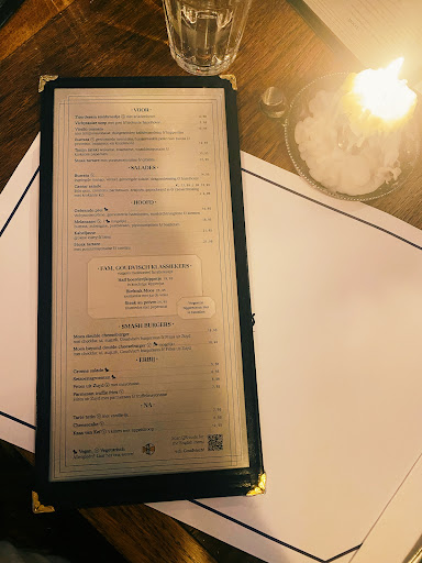 Atmosphere is amazing! The dark wood, mirrors, upper deck, really cute. Service is as per average Dutch standards - you get to wait until you receive attention, hostesses donât seem to pay attention once you have made up your mind. Dinner stretched into 3 hours, most of what would have been waiting on either food or chance to order. Food⌠menu is promising, but flavors are very basic. Mostly under salted, but then steak too salty. Main course comes without any side dishes, which is bit clunky to order, so settle for them chips with fritsaus and lower the expectations. Desert was better but again wait time is longer than you expect for an ice-cream on a cake. Would like to return because it feels good, neighborly but besides...