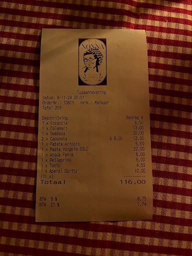 Read moreI went to nonna for dinner with two girlfriends. When you come in you’ll be greeted by an horrendous sewage smell. Once you sit down this smell mixes with the smell of Parmesan cheese, not a lovely mixture as you can image. Secondly, wear a headlight because this restaurant apparently wants to save money on lighting. There are a few dangerous steps you easily miss if you don’t look out. A woman took a nasty fall when we were there and pretty sure she ended up getting stitches on her shin. The food is extremely bad. We ordered foccacia, which was stale. It tasted like three day old bread from a gas station. You wouldn’t even want to feed it to the ducks. The batter of the calamari was very salty, so I ended up chugging a whole bottle of water. The fish was filleted for us, but with each bite I had a piece fish bone. Lovely. Also it was 30 euros for a very small amount of fish. Not worth it all. The fries were the only good part. The vongole is once again very salty. Better take a big bottle of water with you when eating at nonna, you’ll need it. The vibes are cute, but it stinks and you’ll get very annoyed by the bad food and lacking service. Don’t go here, do yourself a favor and go to a better restaurant when...