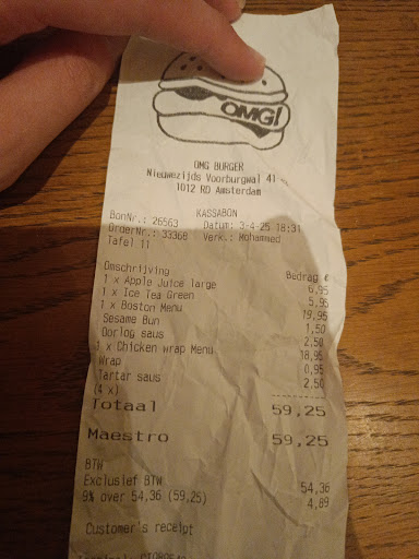 Comparison Price: OMG was 24€ for a burger with fries and sauce on the side to dip. Oh My Buns was 20€ for the same size burger and fries PLUS a soda and ketchup/mayo (free). OMG has an amazing burger, and the fries are chef's kiss. The burger is thick and the sauce is plentiful. We were literally groaning eating this feast our first night here. By the end of our trip, we tried the Deluxe, VIP, and The Smokey. There is an up charge to get ketchup or additional condiments for your fries which is normal in Amsterdam (ketchup was 1,50€ and mayo was 1,75€ for a teeny cup. We were also up charged 1€ for a bun that really should have come with the hamburger -this is where sneaky up-charges come in. Other reviewers noted being uncharged even more for said bun. A can of pop is 4€ (keep your peepers peeled, we've found them at other restaurants for 1€ a can). I was curious to compare burgers and tried Oh My Buns. We tried the triple fatty meal. The burger here consisted of three smash patties instead of one large burger. The meat had great flavor. I do wish it had had a little more sauce. The fries were not as good as OMG's -but I like that the meal included a pop and the dipping sauces were free. Final conclusion: we did like the flavor of OMG a bit better for both the fries and burgers. This said, there was a 5€ difference in price -Oh My Buns was cheaper and the soda & sauces were free. You can choose to get just the burger and fries from Oh My Bun and it would be 8€ cheaper (if you’re comparing burger and fries prices only). 2,50€ soda at Oh My Bun's; 4€ soda at OMG. So it's a toss up. I would definitely go to both places again. Side note; you do get a few more fries at OMG with takeaway which is awesome. I recommend OMG a smidge more on flavor even through I really like the smash patties at Oh My Bund -but the sneaky bun up charge at OMG really bothers me. It seems opportunistic and taking advantage of tourists. Versus Oh My Bun who had no sneaky up charges and instead offers free fry condiments. I’d prob more consistently visit Oh My Buns for the price -but you should also...
