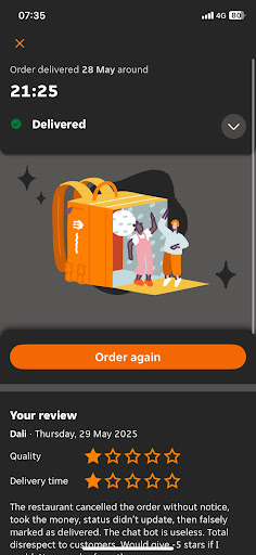 Read moreThe restaurant staff cancelled the order, allegedly because the delivery distance was too far. However, we were never informed. They took our money, we waited for over an hour, the delivery status didnât change, it kept saying the courier was nearby â and now it says âsuccessfully delivered.â Thatâs a complete lie! I never received my order, and no refund was issued. I canât reach anyone for help, the basic chat with their bot assistant is useless and keeps repeating the same phrase like itâs bugged. I will be filing a complaint. This is not about the money â itâs about the total lack of respect for customers. Iâd give them minus 5 stars if I could. Do not order from them under any...
