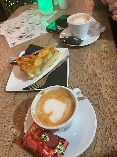 Service asked us immediately if we would like to order something else, before i had my last sip of my coffee. She did this also to the people sitting next to us, so this rude behaviour was already expected. The coffee was ok nothing special it’s drinkable. The pie was the worst pie of my life, it was a frozen cake already bought from the supermarket and they just brought if to me half frozen, fully wet. Also notably my friend wanted to buy the muffin, cause why not and it was displayed on the card for 3.50€. When she wanted to order, the nicer server (not the woman) mentioned that the muffin was in fact 5€ and not like displayed 3.50€. I am very sure they don’t have more than 10 cards, it’s not that hard to replace them or put a sticker on it or even just cross out the price. Alsooo you can’t split the bill, because it’s a system thing. We split everything on this trip and it was never a problem and even the smallest local shop had no problem. This is a shop near the central station where it is expected that there will mostly be tourists, so maybe try to be nicer and give the people a pleasant stay or just search for a different job. By the way while I was writing I saw that she also billed me too much for the apple pie, but I guess they also “forgot” to change the price of the pie one the...