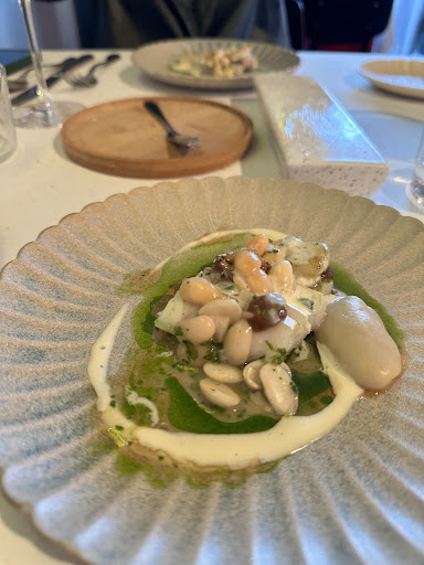 Once seated, the first course of White Asparagus with Zeeland Flat Oyster was bland and uninspired. The second course, featuring Monkfish with Wakame and Leek Terrine, Smoked Eel, and a Cream of Capers and Raisins, fell flat with weak flavors and insufficient smokiness.