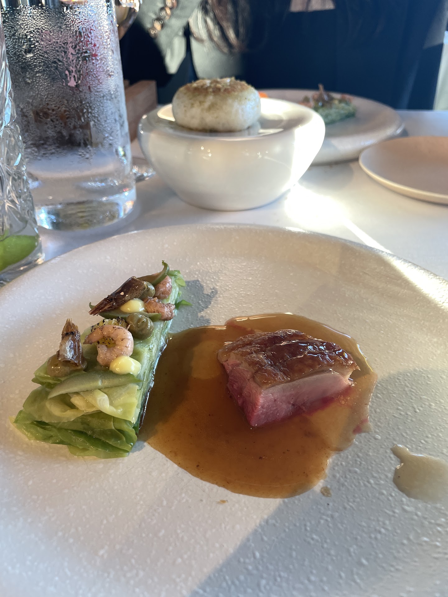 The main course, their version of Peking Duck, included a steamed bao filled with duck leg confit, which was the only highlight—soft and flavorful. Unfortunately, the duck was too gamey, and the sauces did not complement the meat. The combination of cabbage and shrimp was dry and lacked the expected umami.