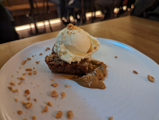 We were excited for the variety and chose two items from every category on the short but very thoughtful menu. We thoroughly enjoyed everything we ate. Favorites were the fries, which were the perfect texture, with tangy, almost sweet mayo; the lamb with carrot and yogurt, lots of flavor and the meat perfectly cooked; and the true standout, the peaches and cucumber starter with feta, walnut, and radish, the sauce from which we mopped up with bread and I could've licked off the plate. I could eat those peaches daily. The dessert of date cake with tahini cream was also very unique and fun, the cream tasting almost cheesy.
