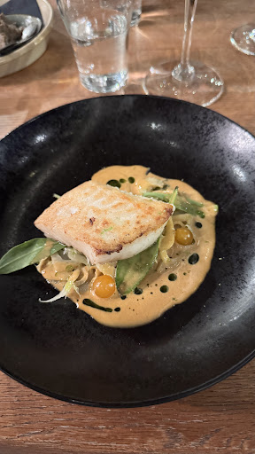 As soon as we sat down, we were served a delightful amuse-bouche, which consisted of a homemade pea purée and some crispy crackers. It was a lovely start! For appetizers, my colleague chose a fennel salad, while I opted for the veal tartare, which was exceptional. For our main course, we both had a veal steak, which was equally delicious. To finish, we shared an almond cake with milk chocolate and a scoop of ice cream. While the dessert was good, it wasn't quite on the same level as the other courses, but still enjoyable.