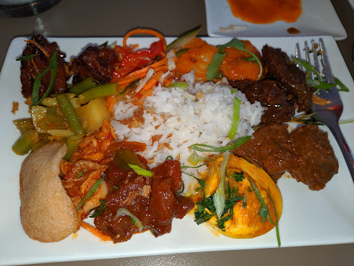 this is a tourist-focused destination (in my opinion), not a place catering to locals or indonesians. We are a mixed Chinese/Korean couple and we were the only Asians in the place besides an Indian couple next to us. the food is ok, maybe decent, but not awe-inspiring or great. If you order the rice table set meal, basically all tables get the same dishes unless you specify an exception (vegetarian, vegan, don't like seafood, etc.). Which means a lot of the food can be mass produced ahead of time and it sort of feels like that is what we got the price of 49 Euro for the food we got seemed pretty precious. The difference between "2 courses" at 41 and 3 courses at 49 is dessert, so you're paying an extra 8 for a shared dessert that was ok, but not worth it the starter (javanese chicken salad) was quite good - that's course #1 the 2nd course is shared rice, a small bowl of asian-themed cole slaw and 8 small dishes - 2 chicken, 1 beef, 1 shrimp, 1 veggie curry, 1 hard boiled eggs, 1 eggplant, and 1 side of shrimp chips - I was shocked by the shrimp chips as one of my 8 dishes. Really? Shrimp chips after the chips that came with the table?!? the 3rd course was dessert - a banana tart, 2 scoops of ice cream, and 2 small pieces of cake. The ice cream was great, the tart ok, the cake was dry and not interesting