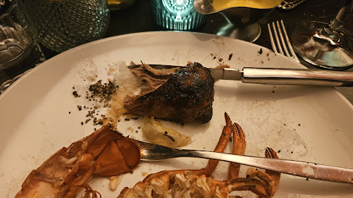 As for the food, I decided to try the raw oysters and caviar, which were of decent quality. While the oysters were fresh and had a subtle, briny flavor, they were challenging to eat without an oyster fork. Similarly, the caviar was enjoyable, but the lack of a caviar spoon made it challenging to fully savor the dish. Unfortunately, the same issue continued with the steak and lobster, which I also ordered. The lobster didn't seem to be as fresh as I would have liked and had many inedible parts. However, the sirloin steak was definitely the standout dish of the night, cooked to perfection and incredibly flavorful. It came with fries, a simple salad, and a hollandaise sauce, which wasn't necessary as the steak was already delicious on its own.