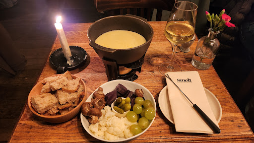 We had booked a low table but when we arrived , we were asked to sit instead at a high table due to a “system error”. Eventually, the waitress let us sit at the low table but not without some discussion. The wine we ordered was quite nice and the waitress explained the concept well. We had two fondues, and one was great regarding taste and temperature. However, the second fondue came out very cold (there was even some unmelted cheese at the top). When we brought this to the attention of the waitress, the first response was that we probably left it too long to eat’. It’s not good practice to put the blame on the customer when the food came out cold and the pot was not lit properly in the first place. The fondue was taken away and brought back 5 minutes later, but was still only lukewarm. There was clearly something wrong with the heating mechanics of the pot which should have been spotted in the kitchen. You are given an egg to make scrambled egg at the bottom of the pot, and to verify that the pot was cold, I tried to cook the egg in it, and 20 minutes later it was still nearly raw (it took 5 minutes in the first one). Additionally, the portion sizes were tiny compared to any fondue I’ve had before and we left still feeling hungry.
