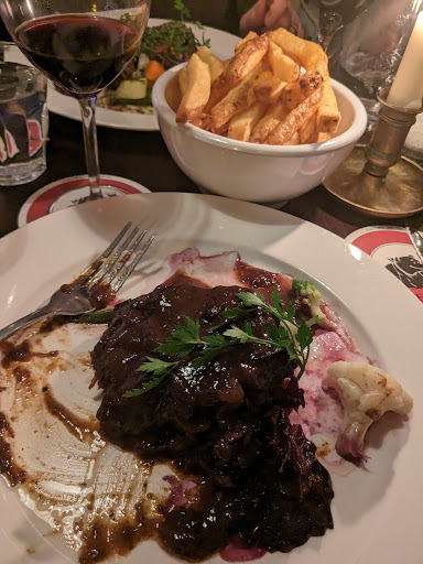 We spelen op âsafeâ: Coq au vin en Hachee. Maar de eerste heeft een enorm zure saus (beaamd door de ober) Ă©n de haan is niet mals maar droog en taai. We krijgen allebei buikkrampen. Ook de groente erbij zijn eerder lentegroente dan najaarsgroente. De hachee is eerlijk gezegd niet veel beter. Het rundvlees is te droog gegaard, ook de rode kooi is heel zurig.