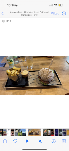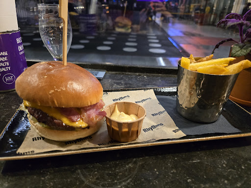 Gelegen naast de Ziggo Dome biedt deze plek mooie kansen om succesvol te zijn. Helaas stelde het bezoek aan Ryythms ons enorm teleur. We stonden in de rij voordat we konden eten. Groepjes van 2 mochten allemaal voor. Wij hebben daardoor met ons groepje van 4 zo'n 20 minuten moeten wachten voordat we konden zitten. We konden plaatsnemen aan de zijkant, met zicht op het plein voor de Ziggo Dome. Achter ons zagen we de open keuken met personeel dat niet heel hard leek te werken in vergelijking met de drukte die er was. Bestellen gaat via een QR code. Daarbij wordt aangegeven dat de gehele bestelling tegelijkertijd komt. Voor de eerste ronde bestelden we dus drankjes en nacho's. De drankjes kwamen eerst keurig binnen enkele minuten langs. De nacho's, die overigens vrij karig waren, kwamen iets later. Bij de warme nacho's met kaas moet je zelf de saus erbij doen (of dippen). Toen bestelden we het hoofdgerecht. We bestelden alle 4 een hamburger. Na 50 minuten wachten zijn we naar de keuken gelopen. Daar werd ons beloofd dat deze (medium rare burger) binnen 4 minuten geleverd zou worden. Dit werden er 8. De burger die we kregen had weinig smaak. Net zoals de friet die we erbij kregen. Daar hebben we zelf maar zout overheen gedaan om het iets van smaak te geven. Na het lange wachten werd ons niet eens iets aangeboden. Daarnaast konden wij tijdens het lange wachten observeren hoe één van het keukenpersoneel een aantal hapjes zelf op at tijdens het opdienen. Erg jammer als je zelf al bijna 3 kwartier aan het wachten bent. Geinig dat er een DJ live muziek aan...