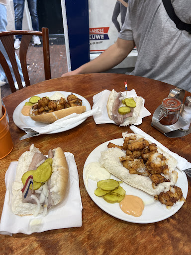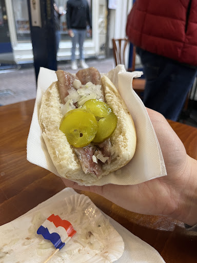Ā Ā Ā Read moreWent to try their salted herring and it was Super delicious - the pickles really made the fish taste pop! I ended up ordering another one after the first one because it was so good. Great quick picker-upper, right at the heart of amsterdam central. There are only two tables inside the shop as it is very small. It costs 4⬠for the herring w bread and 3.5 without. I docked one star because their sanitation is a little questionable - no gloves, and they handle the food prep and money (cash only) without washing their hands⦠and one of the people behind the counter also coughed on someoneās food as he was...