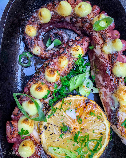 The KRAKEN or grilled octopus dish is a generous portion for one person dotted with bright saffron laced aioli. The octopus is steaky, not rubbery; the aioli is mellowed by the saffron where, actually, a more assertive pungent aioli kicking with garlic would pair well with the octopus and grilled lemon wedge.