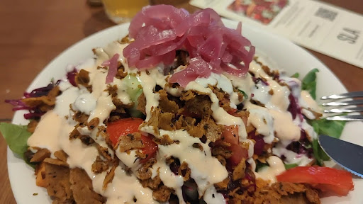 The food is delicious, the pallet of different tastes found in one bowl of salad is amazing. Would definitely recommend this, there is also a loyalty program with which you collect points for every euro spend, by 100 points you get a €7,50 discount on the purchase. The women behind the counter were very friendly, Unfortunately on the time of my visit the place was near empty, so while very relaxing the atmosphere was hard to determine, however the visuals atmosphere makes this a calm establishment. With multiple restaurants around Amsterdam surely i walk in another one sooner rather than later. I tried "The Killer salad" which was spicy 🔥 they use a meat substitute called seitan: